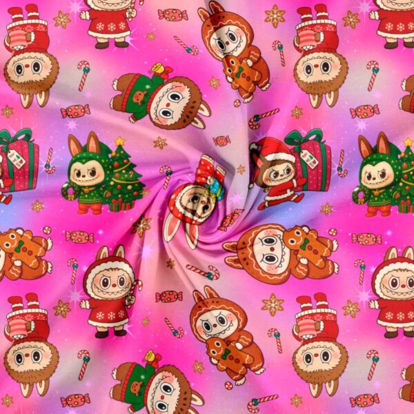 Cotton jersey printed with Christmas Labubu – 2 is a digital print on single jersey knit made of 95% cotton and 5% lycra, 220 g/m² and 160 cm wide.