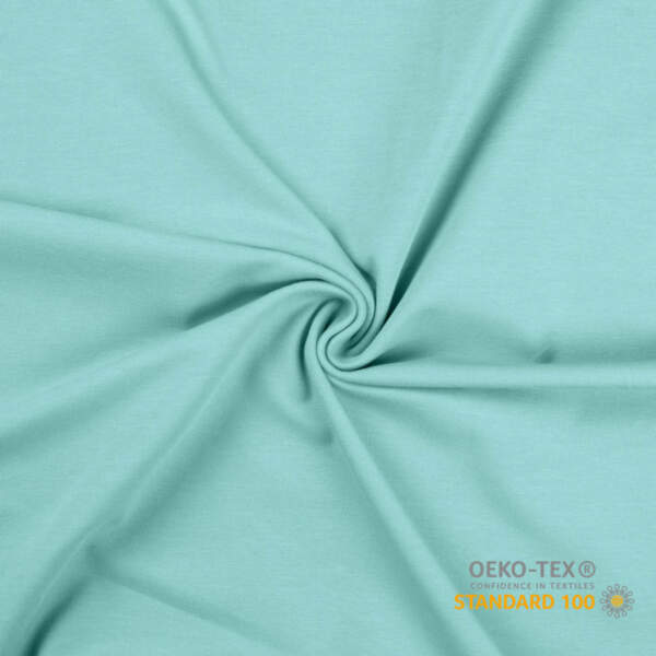 Aqua-sävy tuo raikkaan vivahteen niin aikuisten kuin lastenkin vaatekaappiin. Yhdistä tämä jersey-kangas kontrastivärisiin resoreihin luodaksesi persoonallisia asukokonaisuuksia. Jos etsit hieman tiiviimpää rakennetta, tutustu myös interlock-kankaisiimme.